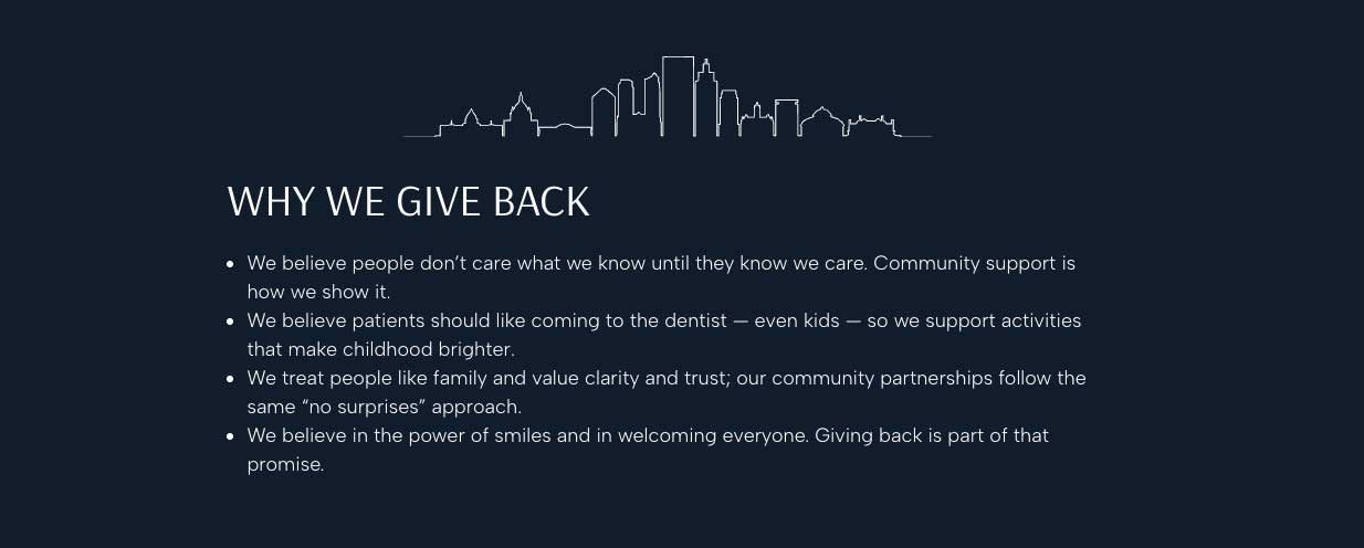 - Highlight 1–2 consistent commitments: school sponsorships, local charity drives, free days of dentistry, sports teams.