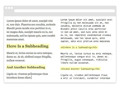 You can create headings and subheadings right in the HTML code for your page, or you can create them with a WYSIWYG editor in your content management system (like WordPress or Squarespace). You should only have one H1 tag on your page, for the page title, but you should put your keywords in H2 and H3 tags in the HTML.