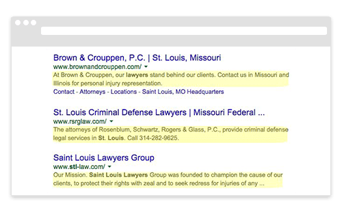 Did you also notice in the example above that certain words were bold (namely, “St. Louis lawyers”)? That’s because Google bolds the words in your meta description that match the search query. You want your meta description to use the keyword or phrase people search for. That way, when your page pops up, their query is bold. That sends the message you have what they’re looking for.